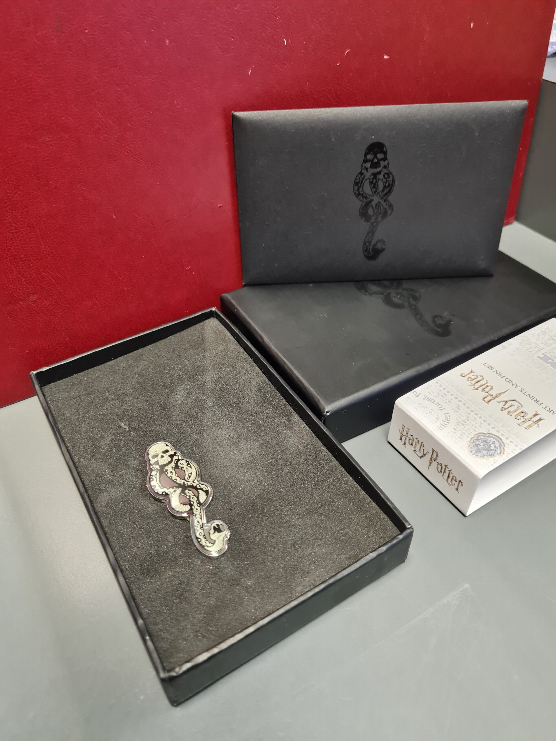 Harry potter pin badge dark mark, with art prints included in a sealed envolope.