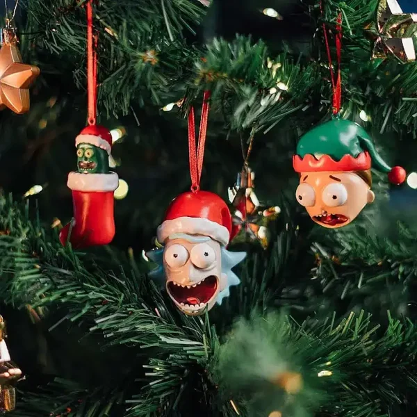 Rick, Morty and Pickle Rick. Set of three Rick and Morty Christmas decorations made of resin and hand-painted. Includes satin ribbons for hanging on the Christmas tree. Each ornament measures approximately 7 × 7 cm.
