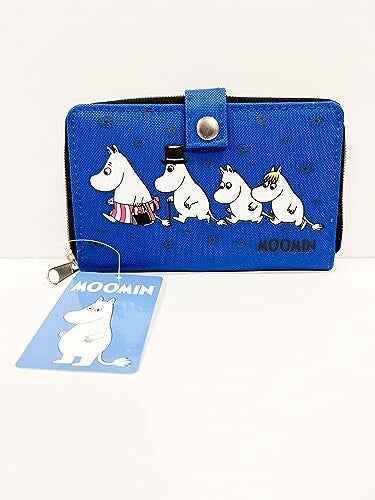 Features zip-up closure with popper, a central zip-up coin pocket, three note pockets, and the Moomin characters on the front.